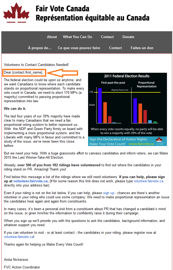 Missing Wikipedia's fundraising campaigns? The mail I received from Fair Vote Canada misses Jimmy Wales's picture and the personal aspect, but at least they tried hard.